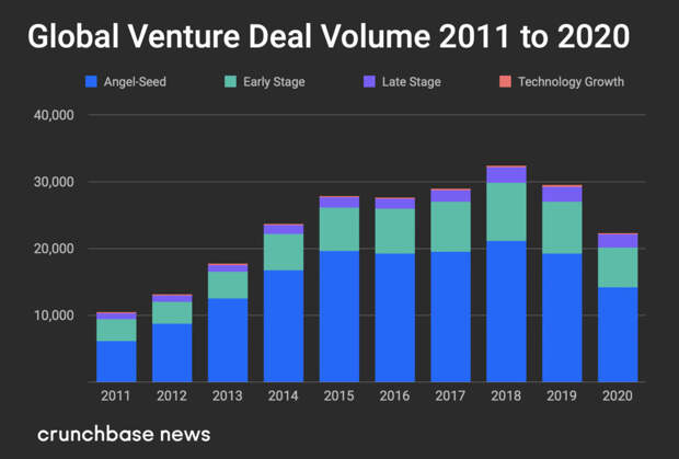 Инвестиции на ранних стадиях в четвертом квартале 2020 года показали снижение в 7% за квартал и 27% за год. Финансирование поздних стадий увеличилось по сравнению с прошлым годом на 4%.