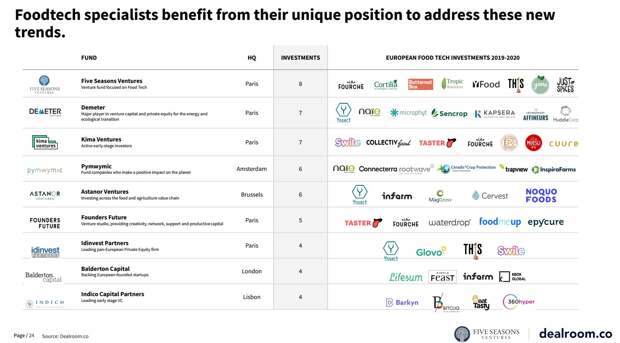 В то же время пандемия показала неэффективность цепочки поставок продовольствия и необходимость новых технологических решений, считают составители отчета. Вследствие этого растут инвестиции в автоматизацию, роботизацию процессов для foodtech, а также в производство и фермерство. Также в отчете представлен небольшой рейтинг европейских foodtech-инвесторов.