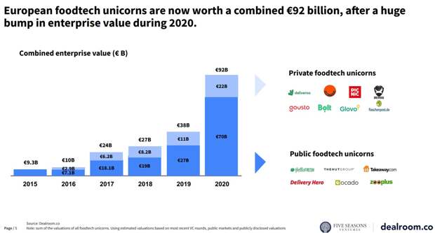 Общая капитализация компаний на европейском foodtech-рынке, поднявших раунды в 2020 году, увеличилась до €92 млрд (+156% в сравнении с 2019 годом). Но все равно капитализация в 2 раза ниже, чем в США и в 3 раза ниже, чем в Азии.