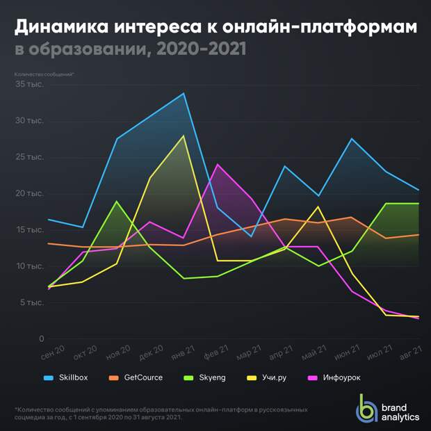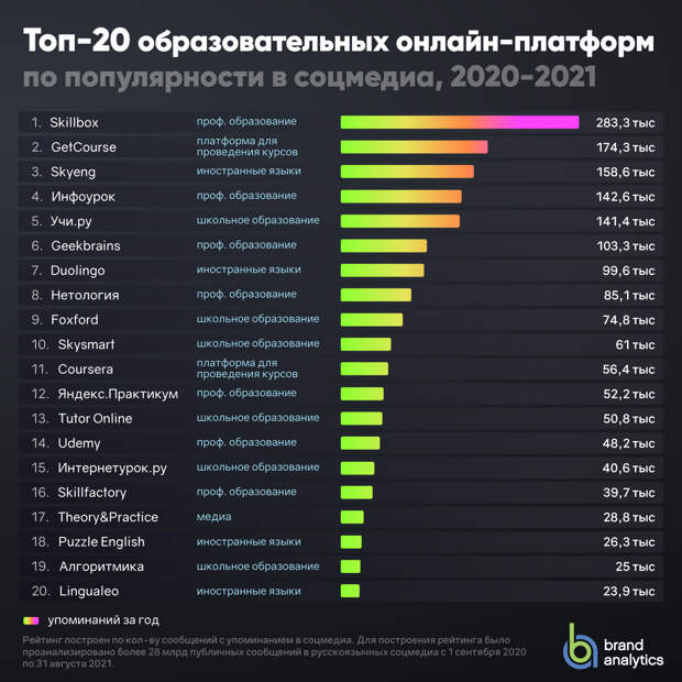 К началу учебного года Brand Analytics впервые представила рейтинг популярных сервисов онлайн-образования, составленный по числу упоминаний образовательных онлайн-ресурсов в русскоязычных социальных медиа за год, с 1 сентября 2020 по 31 августа 2021 года.