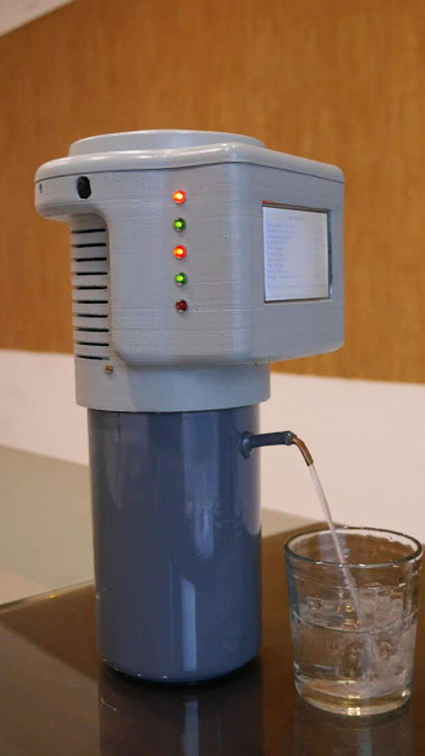 Устройство, похожее на электрический чайник, превращает атмосферную влагу в питьевую воду. В основе изобретения лежит термоэлектрический эффект Томсона и Пельтье. Аппарат забирает воздух при помощи насоса, конденсирует содержащуюся в нем влагу, фильтрует и минерализует ее. На выходе получается обычная вода.