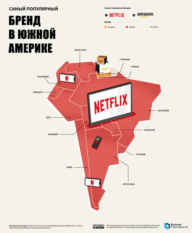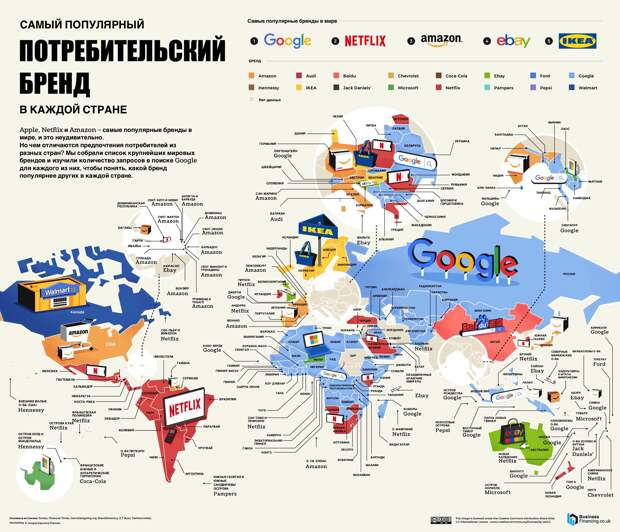 Самые популярные бренды в мире — это преимущество онлайн-компании, большинство из которых — американские. Действительно, четыре лидера (судя по количеству стран, где они наиболее востребованны) — это американские веб-сервисы: Google (100 стран), Netflix (45), Amazon (30) и eBay (11). При этом Amazon присутствует только в 18 странах.