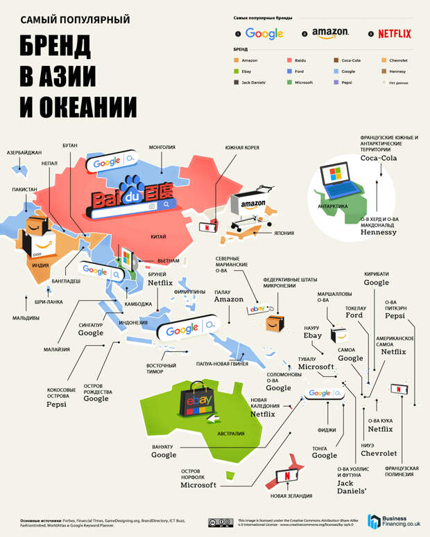 В этом регионе Google и Amazon уже не доминируют. Жители островов Южной части Тихого океана обращаются к поисковой системе, когда хотят пить: больше всего запросов у Pepsi (острова Питкэрн) или Jack Daniel’s (Уоллис и Футуна). А Baidu занимает место Google в Китае, где американский поисковик запрещен. Фактически Baidu — вторая по популярности поисковая система в мире.