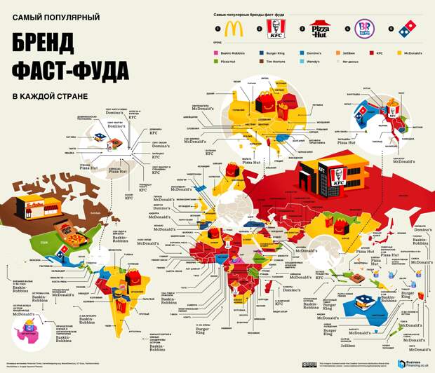 McDonald's — самый популярный бренд фастфуда в 75 странах. Количество поисков McDonald's (27 090 830) обгоняет статистику KFC (9 601 550), который является самым популярным в 65 странах мира, и Pizza Hut (18 111 090), который является самым популярным в 28. Патриотически настроенные канадцы предпочитают искать Tim Hortons. Этот бренд мало известен за пределами Северной Америки.
