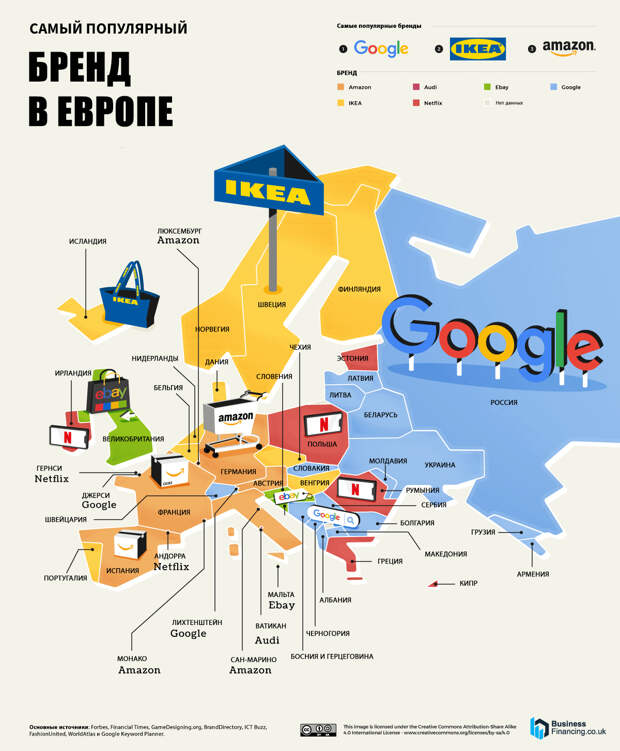 IKEA работает на всех континентах, кроме Южной Америки, но в Европе у нее в два раза больше магазинов, чем во всем остальном мире. IKEA преобладает в Скандинавии, Amazon — на юго-западе континента, а Netflix и Google — на востоке.