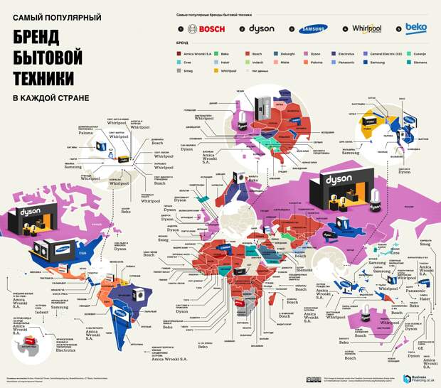 Немецкий производитель бытовой техники Bosch является самым популярным брендом в своей категории в 69 странах. Однако у занявшего второе место Dyson (30 стран) больше запросов (1 142 285 против 883 085). Может показаться удивительным, что Samsung, будучи брендом бытовой техники номер один в 26 странах, занимает всего лишь третью позицию.